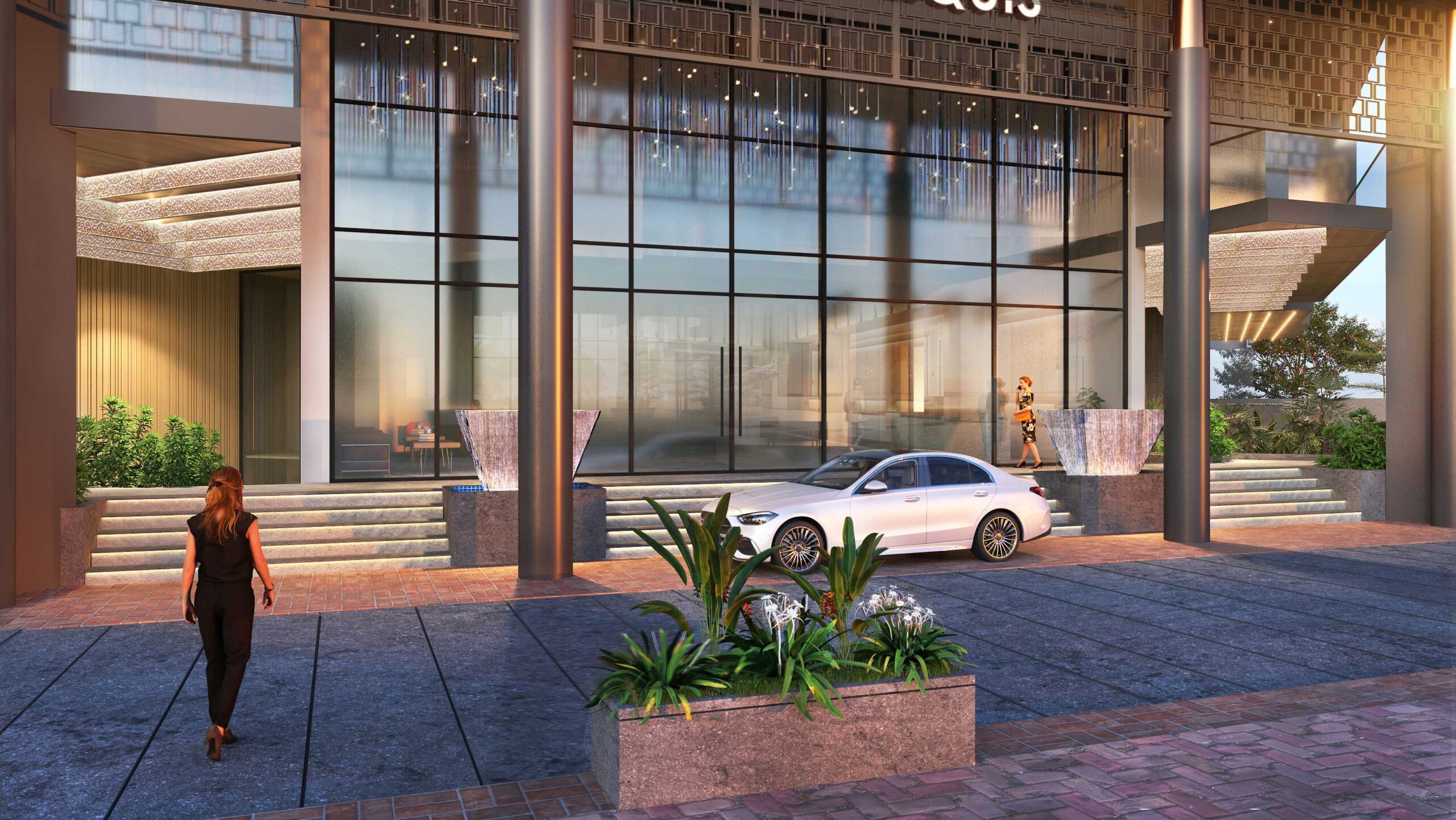 Spazieren Sie entlang des schimmernden Wasserfalls, der den Eingang umgibt, mit üppigem Laub, so dass Naturtaschen einen Spritzer Grün hinzufügen können, der die Ästhetik dieser modernistischen Oase verbessert.