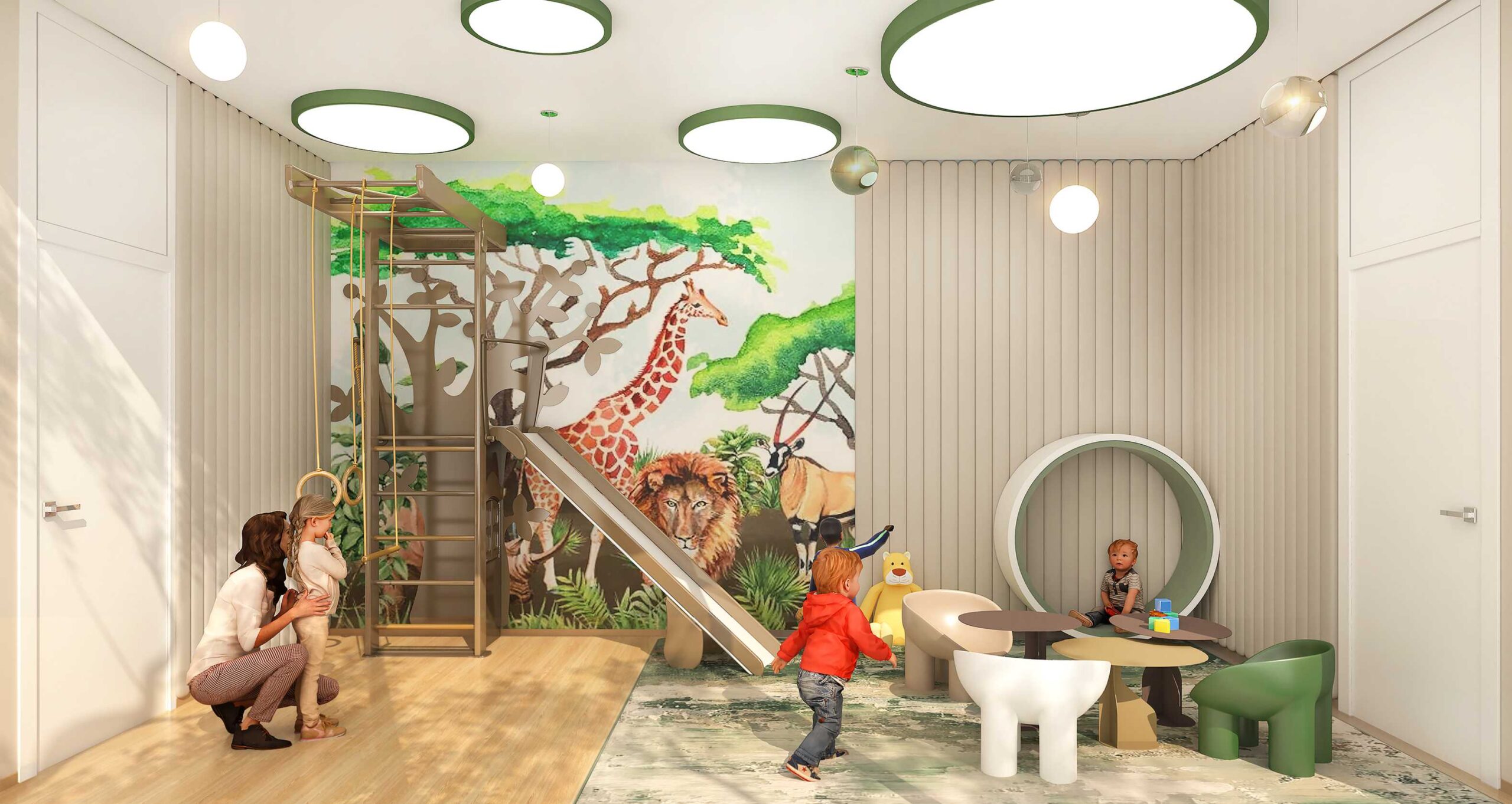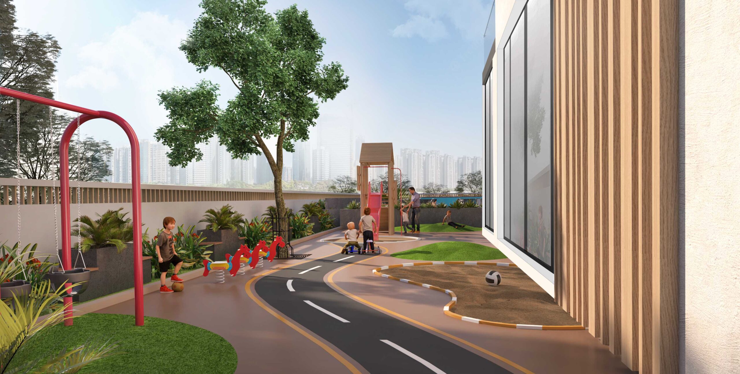 Der weitläufige Kinderspielplatz ist reif für zahlreiche lustige Aktivitäten wie Schaukeln, Rutschen, einen Sandkasten, einen Grashügel usw., die Ihre Kinder sicher beschäftigen werden, während sie herumlaufen und überschüssige Energie verbrennen und eine sichere Zone für Kinder bieten, um Spaß zu haben.