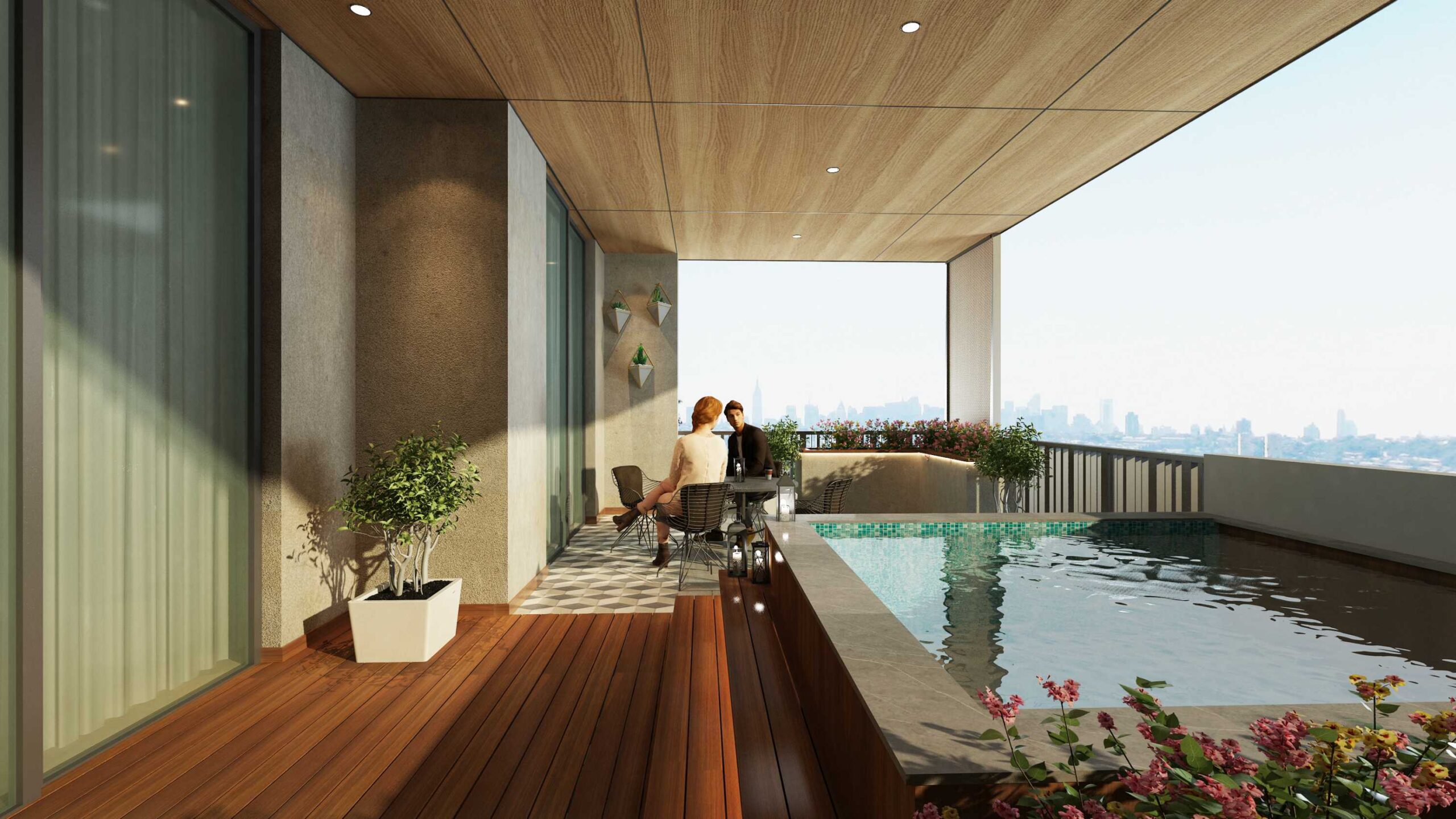 Gönnen Sie sich ein Stück privater Zufluchtsort! Unsere Balkone bieten ein spektakuläres Panorama auf das weitläufige Gelände von Arjan. Tauchen Sie ein in die Glückseligkeit Ihres privaten Tauchbeckens und blicken Sie in die weite Aussicht auf die glitzernde Himmelslandschaft!